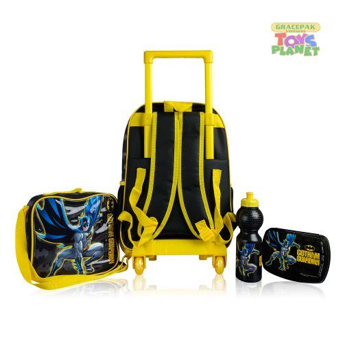 Durable and lightweight polyester upper Contrast batman dark Hero inspired prints Dual compartments with zip around closure Dual side mesh slip-in pockets Padded and adjustable shoulder straps Retractable two-stage trolley handle Silent, two 180 degree rubber